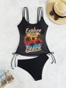 Swim Lushoire Women's Vacation Marble Print Casual Bikini Set, Two-Piece Bikini Set With Cover-Up Shorts, Random Print Summer Beach