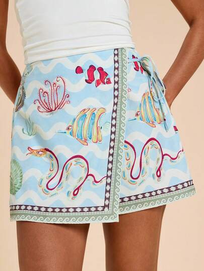 Travachic Váy ngắn nữ đi nghỉ mát, in hình sinh vật biển, vạt bất đối xứng, thắt eo.
