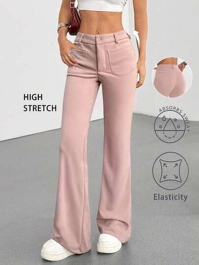 SHEIN Tall 1pc Women's Pink Sweet Commuting & Back To School Knitted Elastic Fabric Low Waist Pocket Slim Fit Flared Leg Casual Pants - Pink - View 1