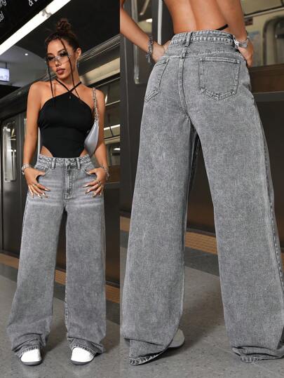 SHEIN Tall Solid Color With Pocket Elegant Wide Leg Jeans - Grey - View 1