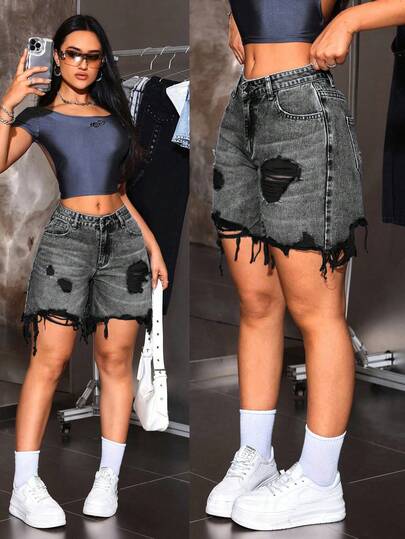 SHEIN Tall Women's Casual Distressed Frayed Hem Denim Shorts With Pockets - Grey - View 1