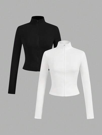 SHEIN Teen Girls All-Match Casual Versatile Zip-Up 2 Pieces/Multi-Piece Set Black And White Tops Girls Tight Tops Tight Tops For Teens Long Sleeve Tops Tight Tops,Spring/Autumn/Christmas,Holiday/Famliy Day/Happy New Year - Black and White - View 1