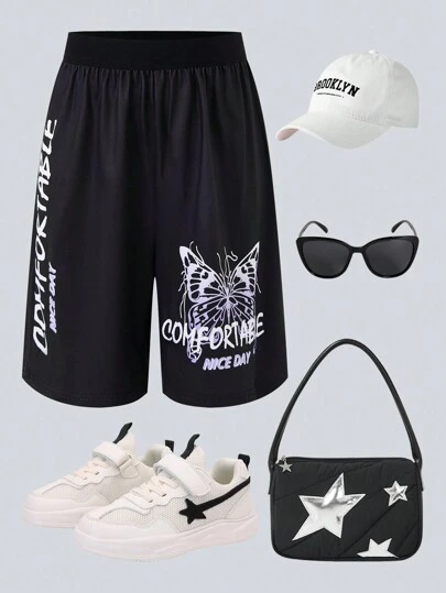 SHEIN Teen Girls Butterfly & Letter Graphic Shorts - Black - View 1