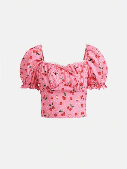 SHEIN Teen Girls Cherry Print Puff Sleeve Ruched Bust Blouse - Multicolor - View 1