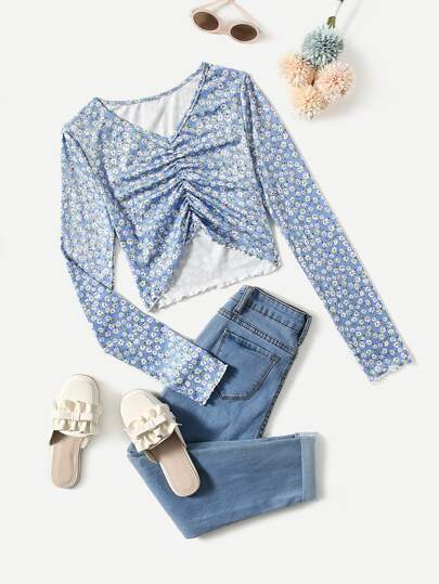 SHEIN Teen Girls Ditsy Floral Ruched Rib-knit Tee - Multicolor - View 1