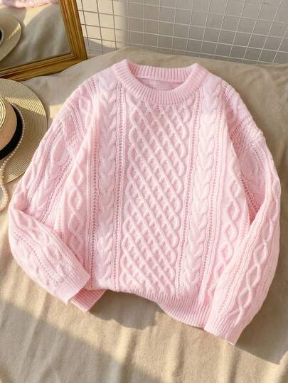 SHEIN Teen Girls' Pink Crew Neck Chunky Cable Knit Casual Pullover Sweater In Fall/Winter - Pink - View 1