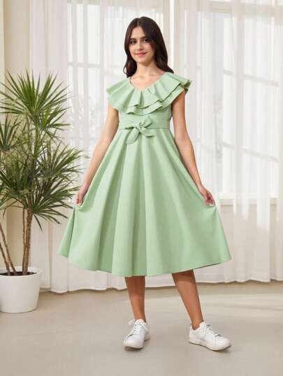 SHEIN Teen Girls' Solid Color Simple A-Line Dress With Ruffle Trim And Bow Decor - Mint Green - View 1