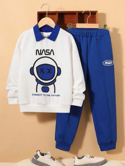 SHEIN Tween Boy Cartoon Graphic Contrast Collar Sweatshirt & Sweatpants - White - View 1