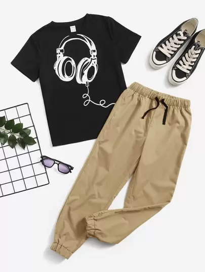 SHEIN Tween Boy Headphone Print Tee & Drawstring Waist Pants - Multicolor - View 1