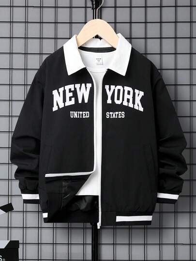 SHEIN Tween Boy Letter Graphic Contrast Collar Drop Shoulder Jacket Without Tee - Black - View 1