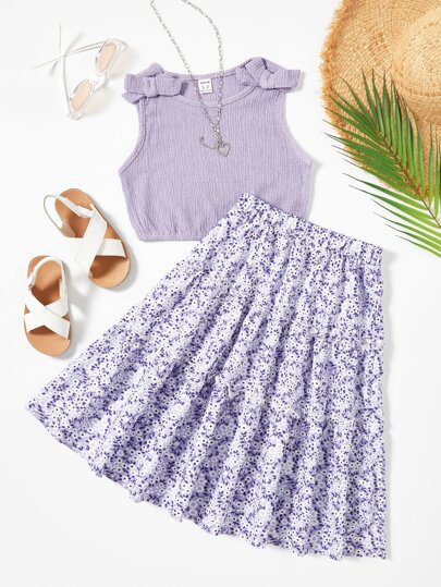 SHEIN Tween Girl Bow Patched Top And Ditsy Floral Skirt - Lilac Purple - View 1