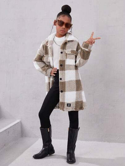 SHEIN Leap Crew Tween Girl Casual Grid Pattern Double-Sided Fleece Jacket For Autumn And Winter - Khaki - View 1