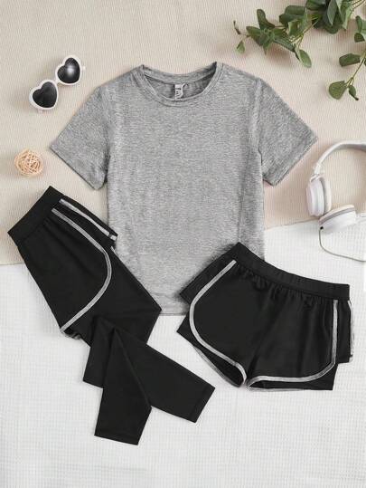 SHEIN Tween Girl Contrast Binding Tee & Shorts & Pants Set - Grey - View 1