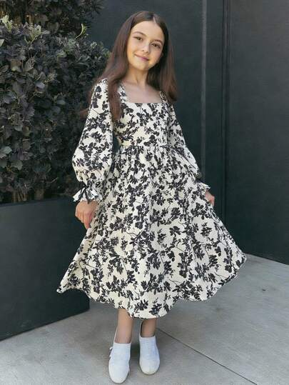 SHEIN Tween Girl Floral Printed Pattern Long Sleeve Dress - Apricot - View 1