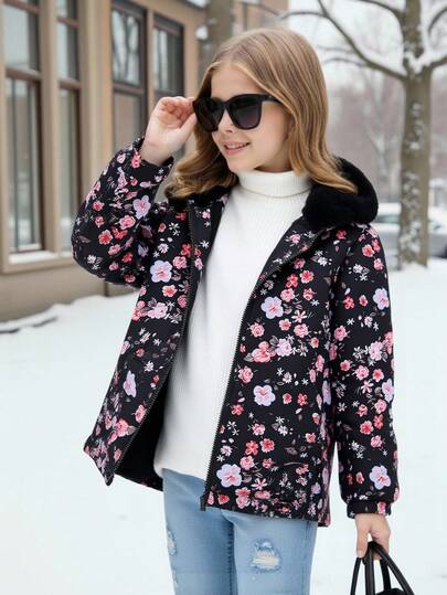 SHEIN Tween Girl Fluffy Collar Hooded Printed Thermal Lined Jacket - Navy Blue - View 1