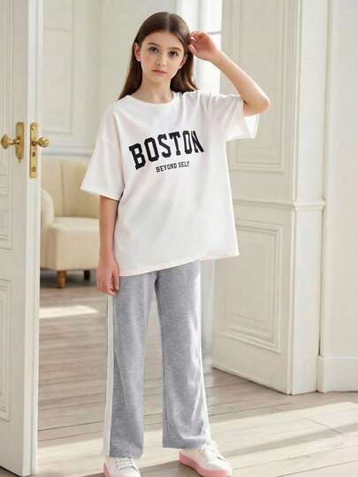SHEIN Tween Girl Knitted Solid Color Letter Graphic Loose Crew Neck T-Shirt And Contrast Color Loose Knit Pants 2-Piece Set - Light Grey - View 1