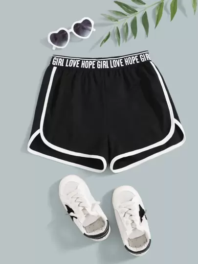 SHEIN Tween Girl Letter Tape Contrast Binding Track Shorts - Black - View 1