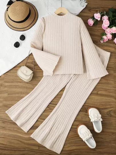 SHEIN Tween Girl Mock Neck Trumpet Sleeve Ribbed Knit Tee & Flare Leg Pants - Apricot - View 1