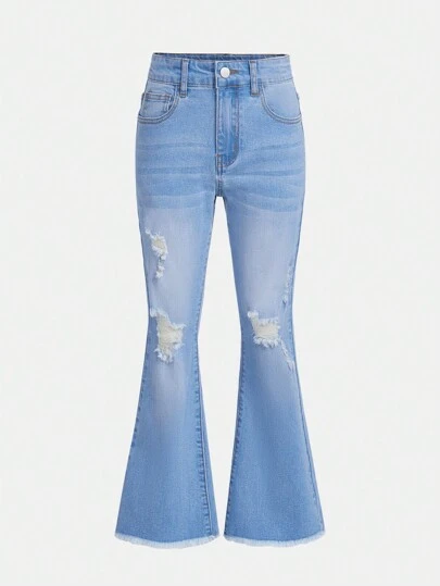 SHEIN Tween Girl Ripped Raw Cut Flare Leg Jeans, School, Campus, College - Light Wash - View 1