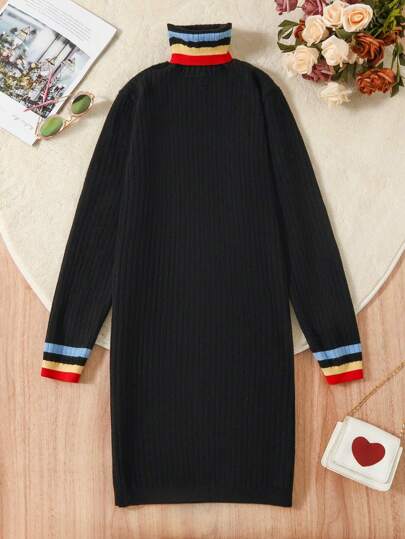 SHEIN Tween Girl's Striped Edge Ribbed Sweater Dress - Black - View 1