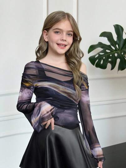 SHEIN Tween Girls Asymmetric One Shoulder Tie Dye Flare Sleeve Mock Layer Long Sleeve T-Shirt - Black - View 1