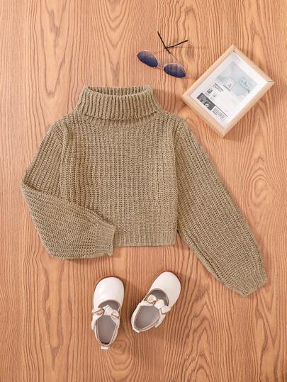 SHEIN Tween Girls' Casual High Neck Oversized Ribbed Knit Sweater - Khaki - View 1