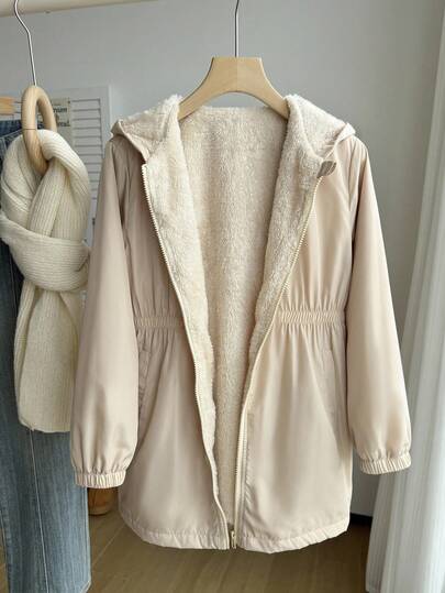 SHEIN Tween Girls Casual Hooded Windbreaker Jacket, Thermal Lined Mid-Length Outerwear, Fall/Winter - Apricot - View 1