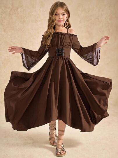 Tween Girls' Elegant Solid Color Open Shoulder Halter Flare Sleeve Asymmetric Dress - Mocha Brown - View 1