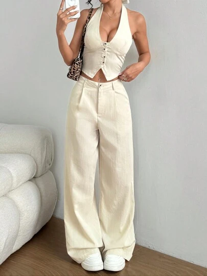SHEIN Unity 2pcs/Set Halter Tie Up Vest And Casual Straight Leg Pants - Beige - View 1