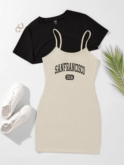 SHEIN Unity High Low Hem Crop Tee & Letter Graphic Cami Dress - Multicolor - View 1