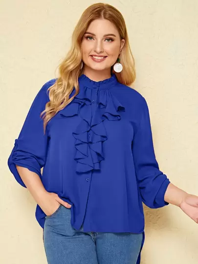 SHEIN Unity Plus Jabot Collar Roll Tab Sleeve High-low Hem Blouse - Royal Blue - View 1