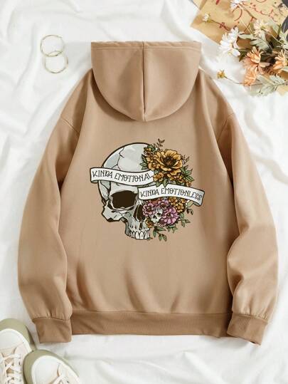 SHEIN Unity Skull & Floral Print Drawstring Thermal Lined Hoodie - Khaki - View 1