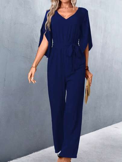 Chiquease Solid Petal Sleeve Belted Jumpsuit - Navy Blue - View 1