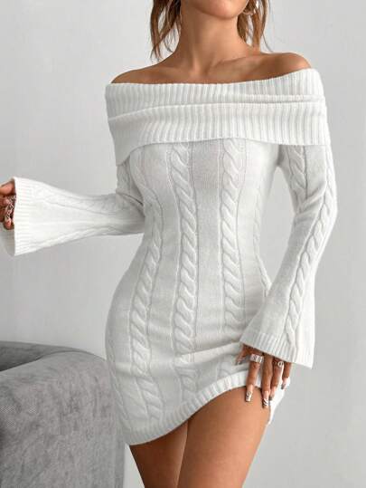 SHEIN Unity Women's Off-Shoulder Elegant Long Sleeve Cable Knitted Bodycon Midi Dress, Autumn And Winter - White - View 1