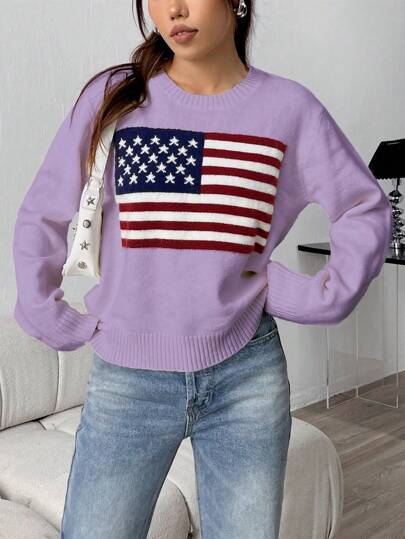 SHEIN Unity Women's Simple Round Neck Long Sleeve Sweater With National Flag Pattern Knit Pullover Fall Winter Outfit - Purple - View 1