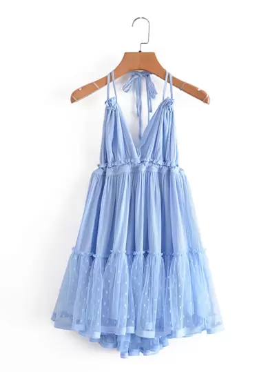 Aveloria Rosie Dobby Mesh Self-Tie Ruffled Halter Dress - Baby Blue - View 7