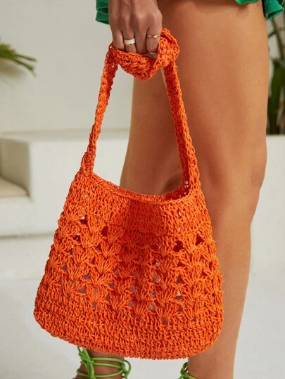 SHEIN VCAY Large Crochet Bag Casual Orange Hollow Out No-Closure Shoulder Bag For Vacation - Orange - View 1