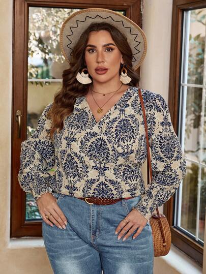 SHEIN VCAY Plus Allover Print Lantern Sleeve Blouse - Multicolor - View 1