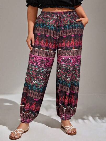SHEIN VCAY Plus Geo Print Slant Pocket Knot Waist Summer Pants - Hot Pink - View 1