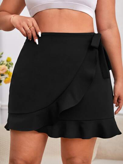 SHEIN VCAY Plus Knot Side Ruffle Trim Wrap Hem Skirt - Black - View 1