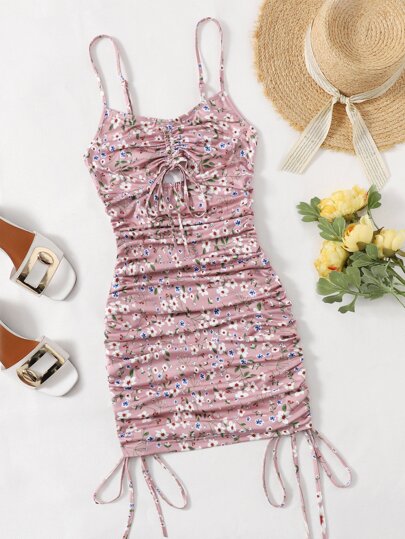 Soleia Ruched Drawstring Ditsy Floral Peekaboo Dress - Dusty Pink - View 1