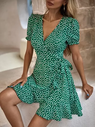 SHEIN Holidaya Ruffle Hem Ditsy Floral Wrap Dress - Green - View 1