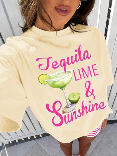 SHEIN VCAY Summer Lemon Cocktail Print Women Round Neck Loose T-Shirt - Khaki - View 1