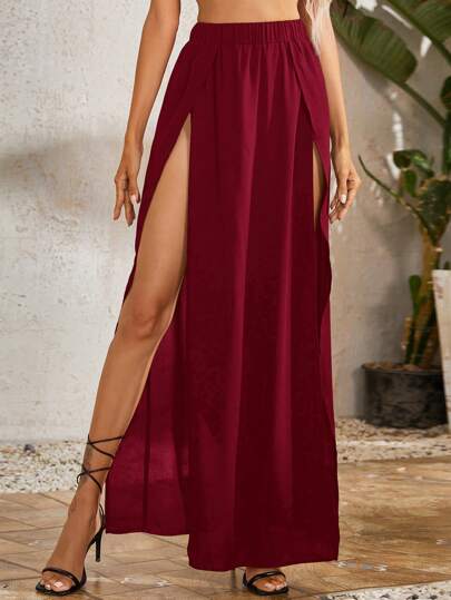 SHEIN VCAY Vacation Sexy Solid-Color High Slit Skirt - Red - View 1