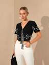 SHEIN Veneréa Women's Solid Color Gold Wire Decor V-Neck Sexy One-Piece Two Pieces Swimsuit