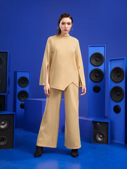 Alisa Split Sleeve Asymmetrical Hem Top & Split Back Wide Leg Pants - Khaki - View 1