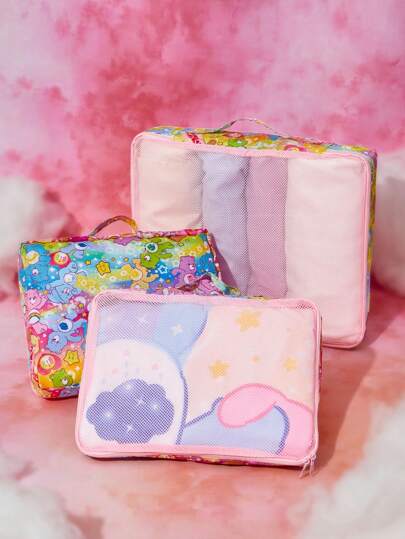 SHEIN X Care Bears 3pcs/Set Cartoon Bear Character Printed Polyester Travel Storage Bags, Mesh Surface, Categorized Storage, Suitable For Various Bag Sizes, Ideal For Short Trips, Long Journeys, Daily Family Storage, And Various Other Scenarios, Suitable For Boys, Girls, Men, Women, And Students - Multicolor - View 1