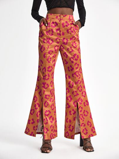 UnHuitMars Allover Print Split Hem Flare Leg Pants - Orange - View 1