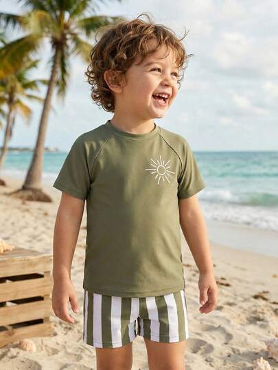 SHEIN Young Boy Casual Fashionable Classic Cool Vacation Style Striped Sun Pattern Slim Fit Round Neck Short Sleeve Swimsuit Set, Suitable For Summer, Beach, Vacation, Swimming - Multicolor - View 1