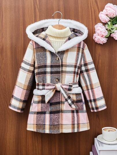 SHEIN Young Girl 1pc Plaid Print Fuzzy Trim Hooded Belted Overcoat Without Sweater - Multicolor - View 1